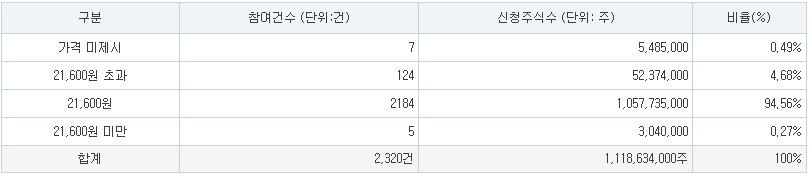 수요예측 가격 분포를 보면 기관 투자자의 대부분이 공모가 상단 가격인 21,600원을 제시했습니다.