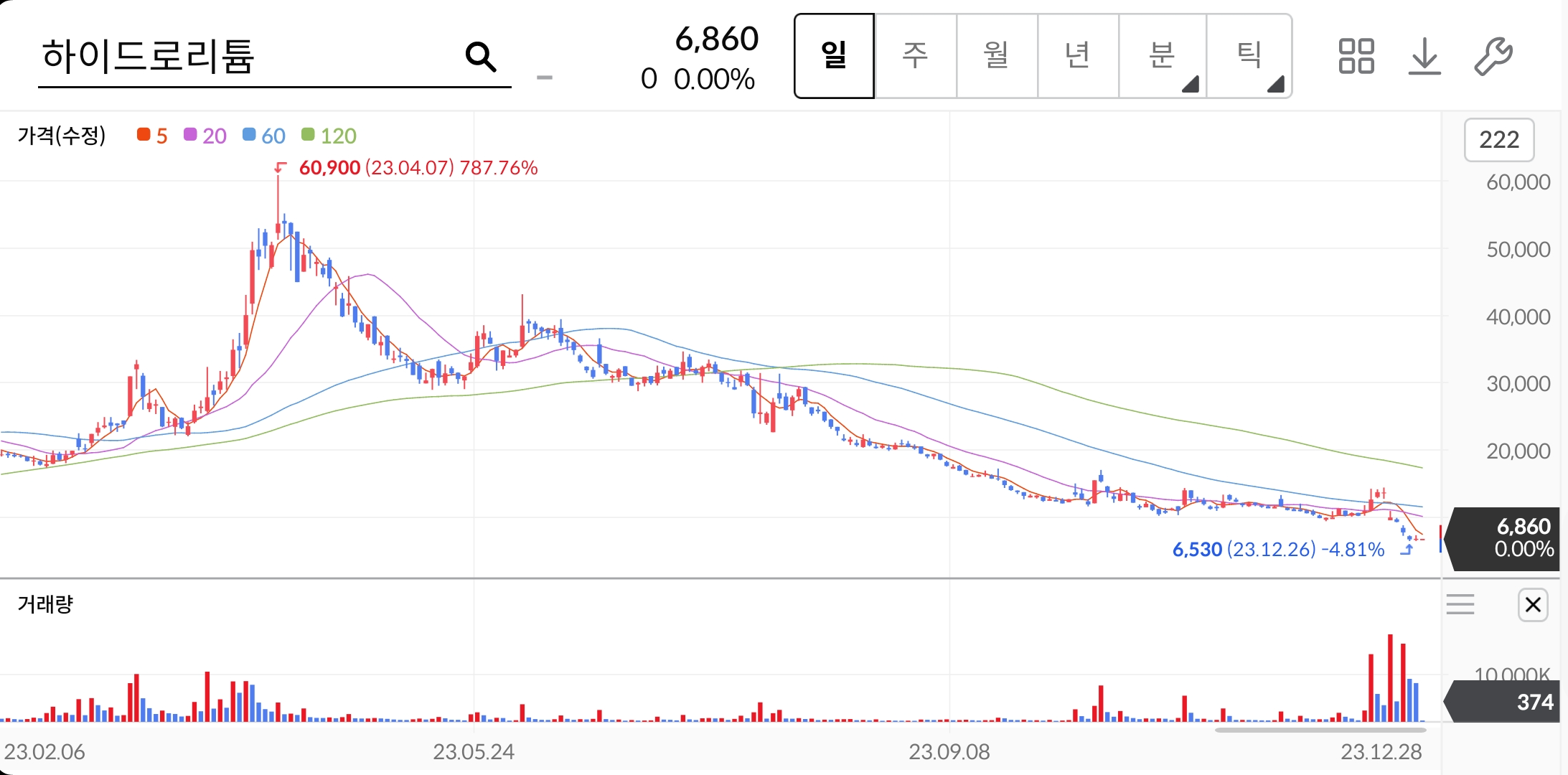 하지만 적자였던 회사이며, 2차 전지 사업을 이제 막 시작하려는 하이드로리튬의 주가는 고점을 형성한 이후 주가가 폭락하고 있습니다. 6만 원대의 주가는 현재 6천 원대의 주가를 형성하며 1/10 수준까지 주가가 하락하였습니다.
