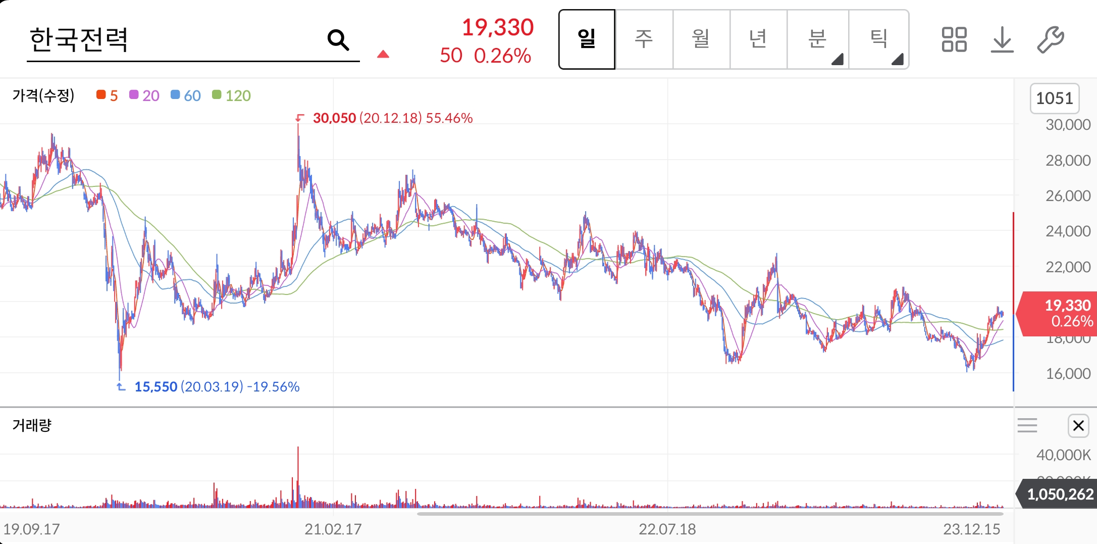 최근 몇 년간 적자였던 실적에 지지부진한 주가의 흐름을 보이고 있는 한국전력의 시기별 주가 흐름에 대해 살펴보도록 하겠습니다.