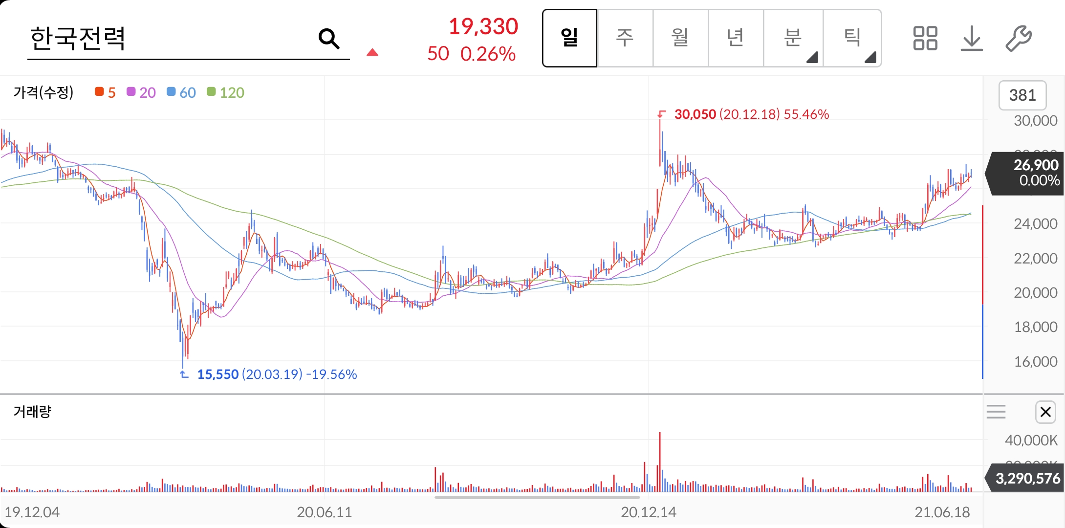 이 시기의 한국전력 주가를 살펴보면, 2020년 3월 16일 코로나로 인해 15,550원까지 주가가 하락하였지만 2020년 12월 18일까지 주가가 회복되며 30,050원까지 상승하였습니다. 해당 시기에 주가가 상승했던 이유로는 이익 증가 흐름이 이어질 것이 기대되었고, 낮은 유가와 원화의 강세로 인해 이익이 개선될 것이라는 기대감이 반영되었습니다.